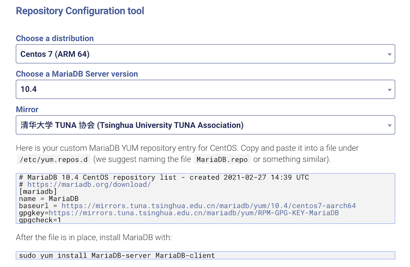 baseurl = https://mirrors.tuna.tsinghua.edu.cn/mariadb/yum/10.4/centos7-aarch64