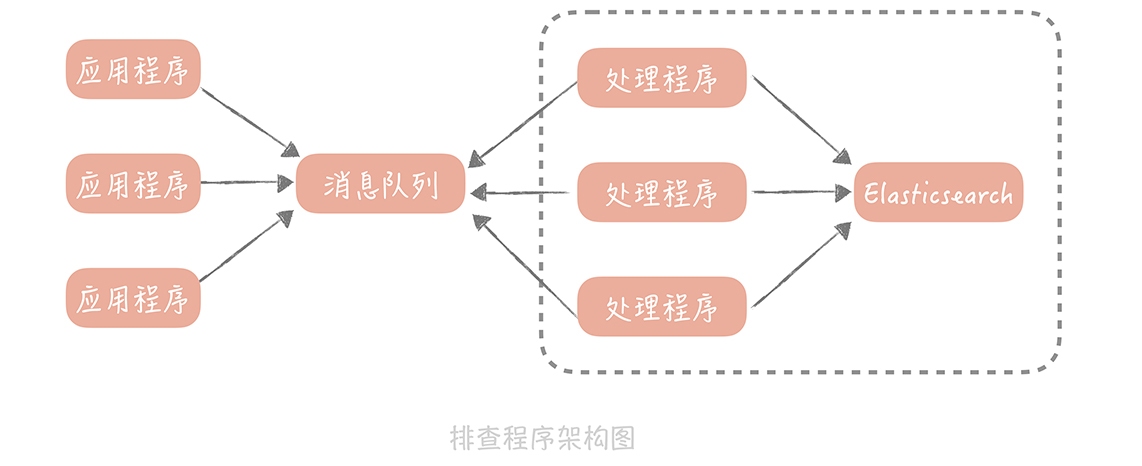 你可以考虑的解决思路是: 把日志不打印到本地文件中,而是发送到消息队列里,再由消息处理程序写入到集中存储中,比如 Elasticsearch。这样,你在排查问题的时候,只需要拿着 requestId 到 Elasticsearch 中查找相关的记录就好了。在加入消息队列和 Elasticsearch 之后,我们这个排查程序的架构图也会有所改变: