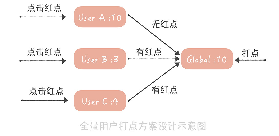 这个红点和系统通知类似,也是一种通知全量用户的手段,如果逐个通知用户,延迟也是无法接受的。 因此你可以采用和系统通知类似的方案。