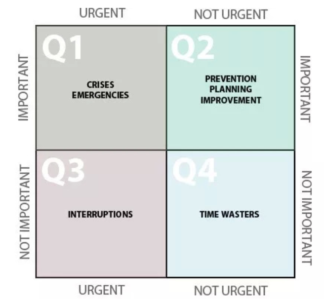 Q1的任务不能避免,又很紧急,比如有严格截止日期的紧急任务、家庭事务、健康问题等,采取积极主动的态度,是节省花在这部分时间的最好方法。