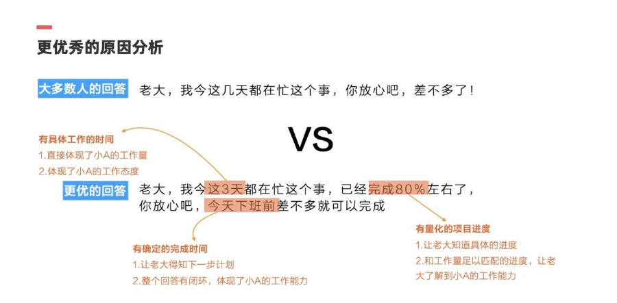 大多数人的回答:老大,我今这几天都在忙这个事,你放心吧,差不多了。更优的回答:老大,我这 3 天都在忙这个事,已经完成 80% 左右了, 你放心吧,今天下班前差不多就可以完成。